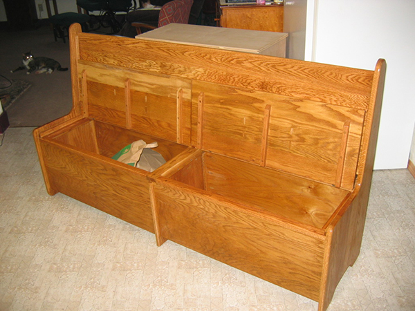 This reader created an oak bench for his son and his wife, with a roomy oak plywood storage area tucked away under the seat.
