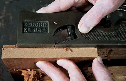 8. When you near the line, it’s time to clean up the vertical wall. Setting the blade flush as we did at the outset will not give a clean vertical wall. In fact, you never try to cut both walls at once. This sloping “vertical” wall is just as it should be. You now turn the body of the plane horizontal and cut the vertical wall.