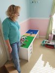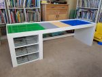 Last summer, I was offered the opportunity to build a Lego table for my wife’s three year old grand-daughter. From a sketch drawn by her daughter, I came up with this final project which was an instant hit with the three year old. It allows twelve Lego base plates on top with an edge lip to keep falling pieces from falling. It also has three shelves for storage trays for more parts. I built it overkill strong, not for all the plastic parts, but just knowing the three year old might (and would) decide to climb up on it. I added plexiglass slides for the trays to save the paint from scraping away.