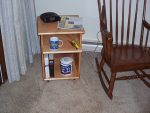 The popular dimensions for this type of table displayed in a bedroom are 18″ x 18″ x 24″ height. I settled for 16″ depth, 17″ width, 22″ height, for and put it in the corner of a dinning room. The piece is made from 3/4″ soft maple. I use the end table for my coffee cup, papers, books, magazines, pencils, letter-openers, radio, etc. The shelf is placed 6″ below the top and slides out 6 inches. One photo shows my homemade hardware.