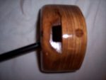 Like most golfers, I also have quite a few old putters laying around that I no longer find useful. I cut the shaft off one of those putters, and designed a new head for it using a piece of that wood. I designed it based on what I wanted in a putter: The largest face allowed by the rules of golf, easy to see alignment marks made of inlaid ebony, and lead weights glued into the plugged holes in the perimeter and rear of the putter to help off line hits roll true. I also adjusted the shaft angle to help avoid skipping when stroking the ball.