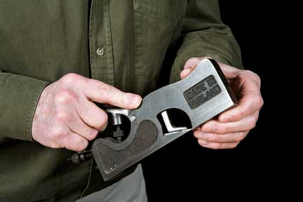 5. You are ready to cut. The grip is fairly intuitive. Three fingers of your right hand go through the handle to meet the thumb. The index finger, like the grip on most tools, points forward. The left hand holds the front end of the tool, thumb on top in the depression, fingers under the sole ready to act as a guide fence. Proper setup and grip precede the practice cuts.