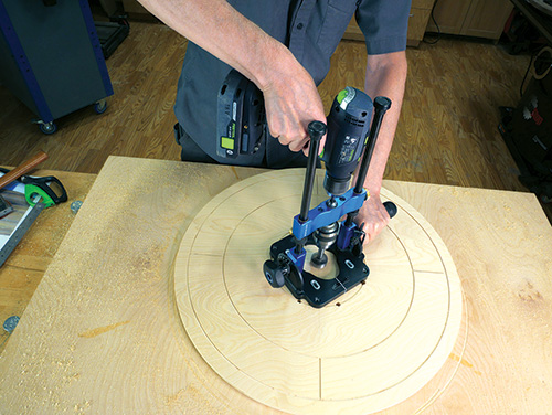 I chose to use a cordless DEWALT router mounted to Rockler’s circle-cutting jig to cut the walnut octagon round. The jig’s adjustability is key to making this project. You can quickly change the diameter with the twist of a knob. Because you will be not only cutting the frame round but also nibbling out a trough into the hardwood, that quick adjustability makes this task much more fun.