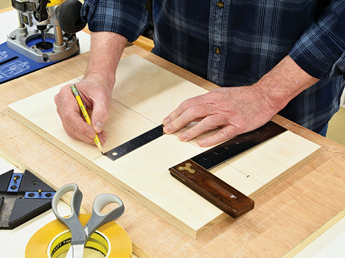 To plot the ellipse, draw center pencil lines on your workpiece for the major and minor axes. Then make marks on each radius to define the size. I’ve marked the lines at 5″ and 7-1/2″ radii for an ellipse measuring 10″ x 15″.